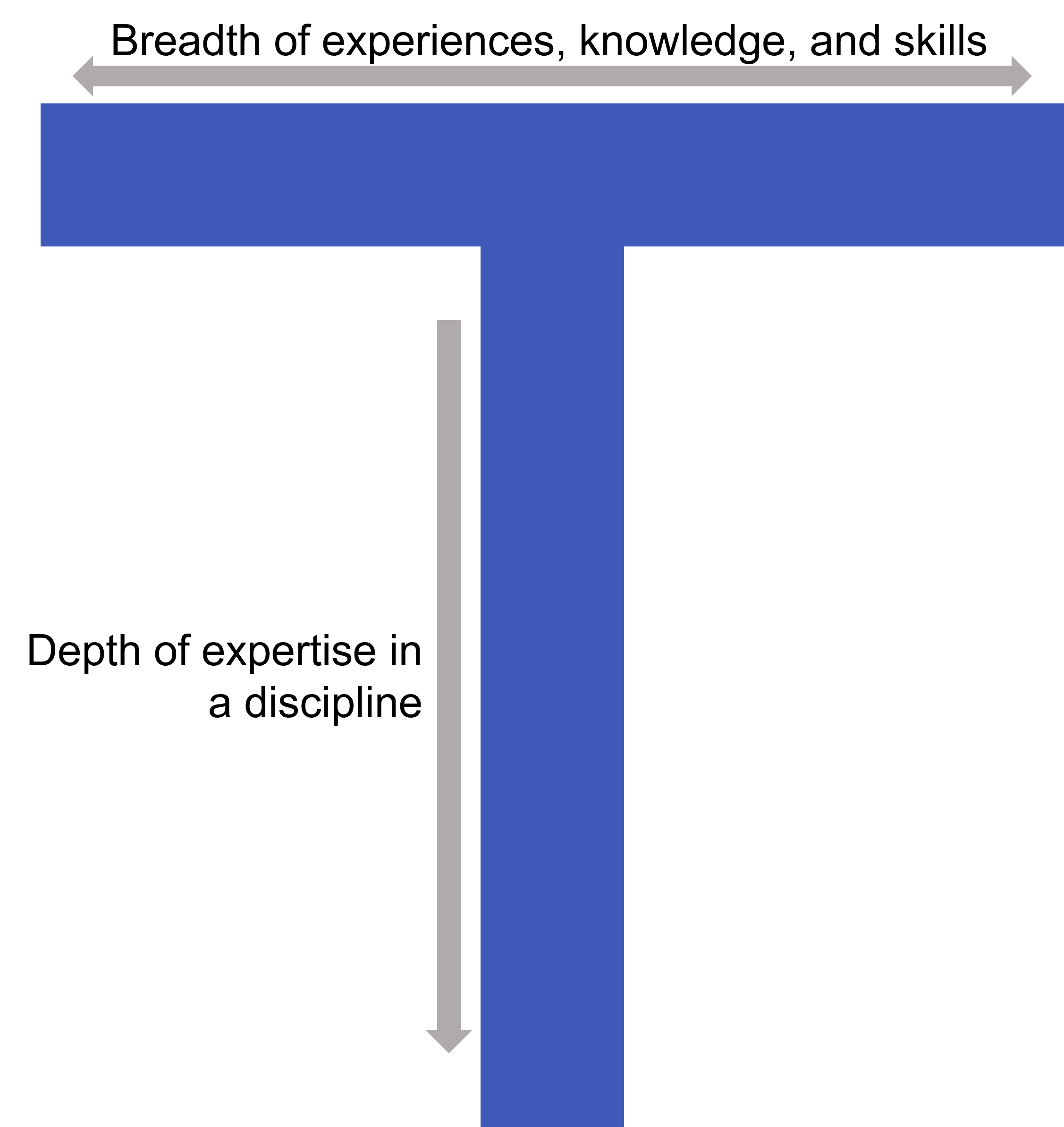 Building the “T” means having knowledge or skills in a discipline and a broad base of supportive knowledge and skills. Think of it like being a jack of all trades, master of (at least) one.