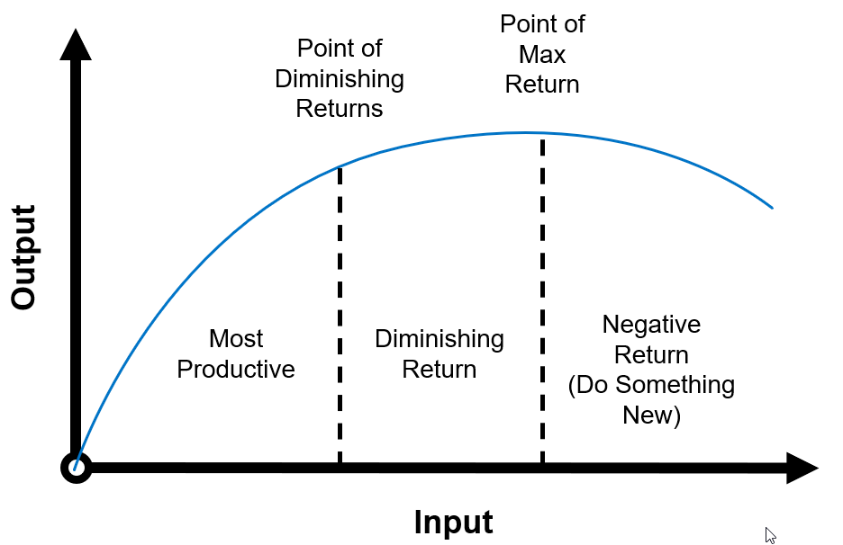 In life, like business, benefits gained will return proportionally smaller gain as more money or energy is invested in it. There’s always an inflection point where more of the same will provide less benefit than it did previously. Money to happiness, time researching to actions made, running to run times.