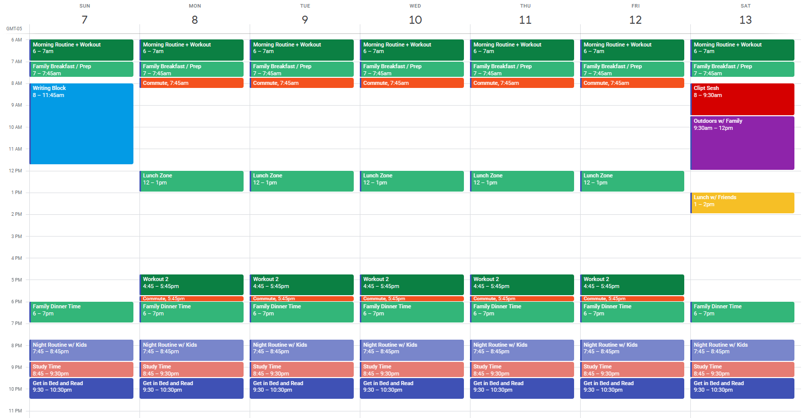 You’ll see I’ve got time in to get back to 2-a-day workouts, family time, a lunch social hour weekly, nightly study time, and a writing block…. I should probably allocate 2-3 hours for that social time. And I’ve intentionally left out most of the business stuff.