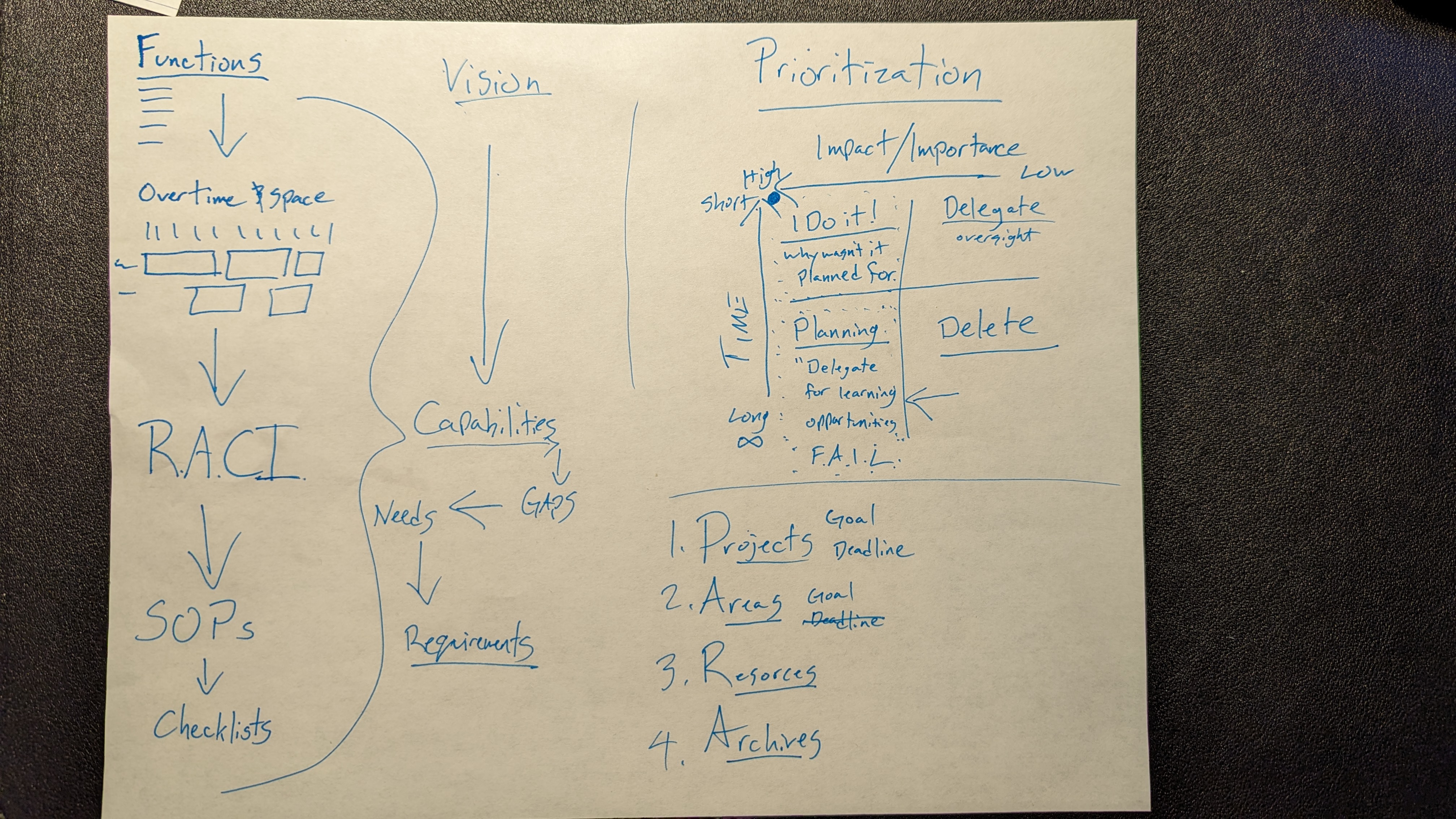 I combine all seven elements of the questions above into a system using Gantt Charts, R.A.C.I charts, and CAPDEV methodologies for developing requirements. I prioritize using the Eisenhower Matrix, and I organize my information using Tiago Forte’s P.A.R.A system.