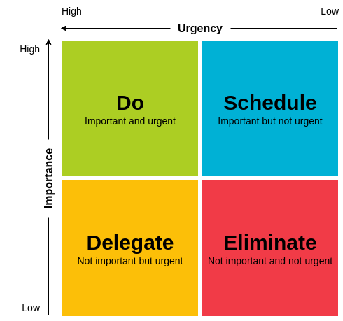 No one’s tracking it and there’s no due date. Items for the “Eliminate” list are the things you think you might need to get done but are really just getting in the way of actually getting work done. It’s work about chasing the status of something or reporting / communicating about work; skip the meeting about prepping for the meeting, fire off a status update and get to doing the skilled work you should be doing in the “Do” list.